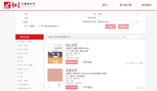 超星汇雅电子书PC页面首页由检索、分类导航、好书精选、最新动态、畅读书单、特色专题、好社好书、院士题词等模块组成。首页通过内容运营展现电子书的优质资源,同时通过最新动态、院士题词模块,让用户了解电子书最新的签约、上架信息和悠久历史。