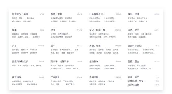 依据中图分类,集中展示电子书22大分类内容或单位特色分类,用户可依据分类快速查找感兴趣的图书。
