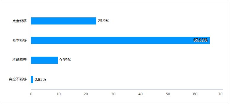 在信息整合能力方面,65.8%的学生表示能够基本将信息整合到课程学习和作业中,而完全能够做到的比例仅为17.95%。对于使用数据库检索系统,64.2%的学生能够基本选择合适的检索途径,但只有18.39%的学生表示完全能够做到。