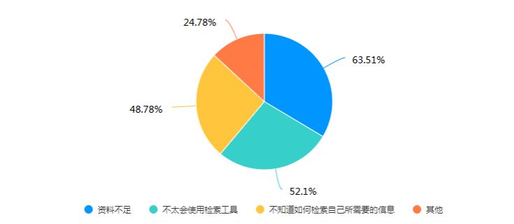 调查还发现,63.51%的学生在查询信息时遇到的主要问题是资料不足,52.1%表示不太会使用检索工具,48.78%不知道如何检索所需信息。这表明在信息检索技能上仍需加强。