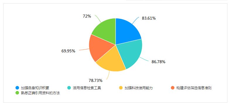 关于信息素养的强化方面,83.61%的学生认为应加强自身知识积累,86.78%认为应活用信息检索工具,78.73%希望加强科技使用能力。高校在提升学生信息素养方面的建议主要集中在培养能力意识(83.76%)和积极提升基础技能(85.37%)。